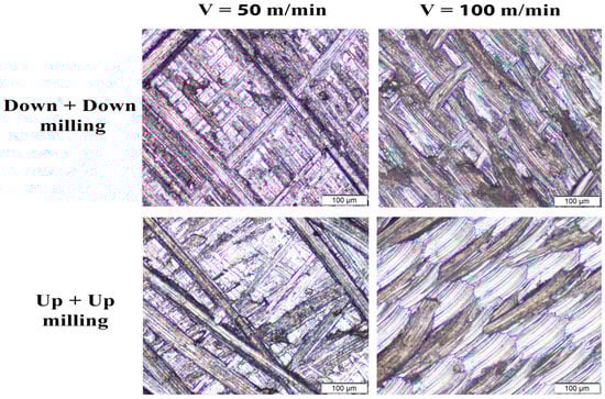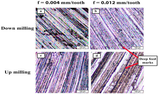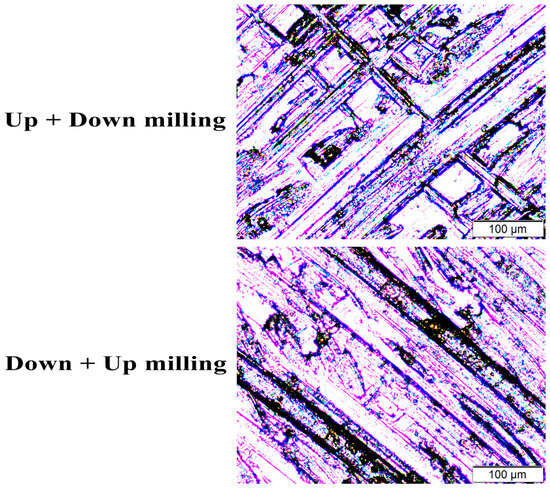 These findings are consistent with previous research [18]. The authors noted that the up-milling process generates a higher occurrence of microcracks than the down-milling process. This discrepancy is attributed to the excessive work-hardened layer induced in the workpiece during up-milling, significantly elevating surface roughness compared to down-milling. Additional studies [21,22] have expounded upon the increased surface roughness in up-milling, linking it to escalating cutting temperatures due to heightened friction. These elevated temperatures detrimentally influence surface integrity, compromising the smoothness of the machined surface [23].