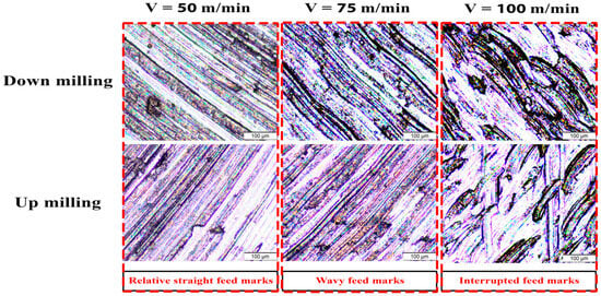 Moving to Figure 8, the surface topographies of milled specimens from up- and down-milling are shown at both the lowest and highest feed rates. The surface textures exhibited pronounced plastic furrows and deep feed marks at the higher feed rate for both milling strategies, indicating diminished surface quality. Furthermore, the impact of tool vibration stemming from increasing cutting speed is evident in Figure 9, which displays the surface textures of milled specimens from up- and down-milling at varying cutting speeds. Notably, at the lower cutting speed (50 m/min), relatively straight feed marks were observed. However, as the cutting speed was increased to 75 m/min, the feed marks became wavy, transitioning to interrupted feed marks at the highest cutting speed (100 m/min). These observations collectively underscore the intricate relationship between process parameters, tool behavior, and resulting surface quality.