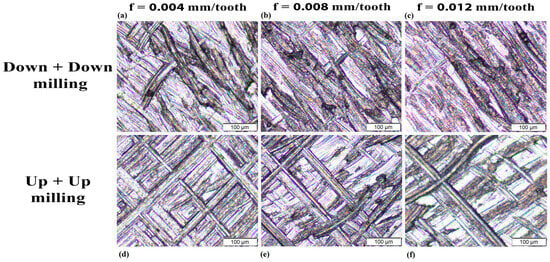 Machined surface texture images for up + up and down + down milling under different feed rates at cutting speeds of 75 m/min. (a) down + down milling at f = 0.004 mm/tooth, (b) down + down milling at f = 0.008 mm/tooth, (c) down + down milling at f = 0.012 mm/tooth, (d) up + up milling at f = 0.004 mm/tooth, (e) up + up milling at f = 0.008 mm/tooth, (f) up + up milling at f = 0.012 mm/tooth.
