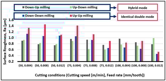 Figure 10 presents the outcomes of measured surface roughness achieved through identical double-mode milling, specifically up-up milling and down-down milling, for various combinations of cutting speed and feed rate. The results indicate that the up-up milling strategy yielded rougher surfaces than the down-down milling strategy across all experimental trials, resulting in an approximately 25% increase in surface roughness.