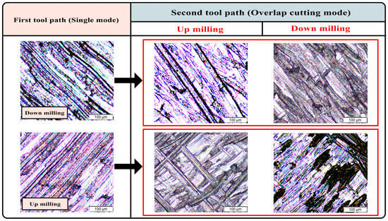 Figure 16 displays surface texture images of specimens that were initially up-milled and down-milled, where both single mode and overlap cutting modes were applied. It is evident that employing up-milling for the second cutting path caused more pronounced scratches on the machined surface with deeper feed marks compared to down-milling, which subsequently influenced the surface quality.