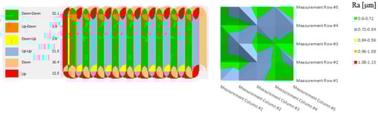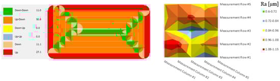 Regarding the second pocket (Figure 18), it was observed that the down-down milling strategy dominated a small central area, while the up-down milling strategy encompassed around 50% of the central region. Regarding surface roughness distribution, the down-down milling region displayed lower surface roughness measurements in the central area, whereas higher surface roughness measurements were recorded in the up-down milling region.
