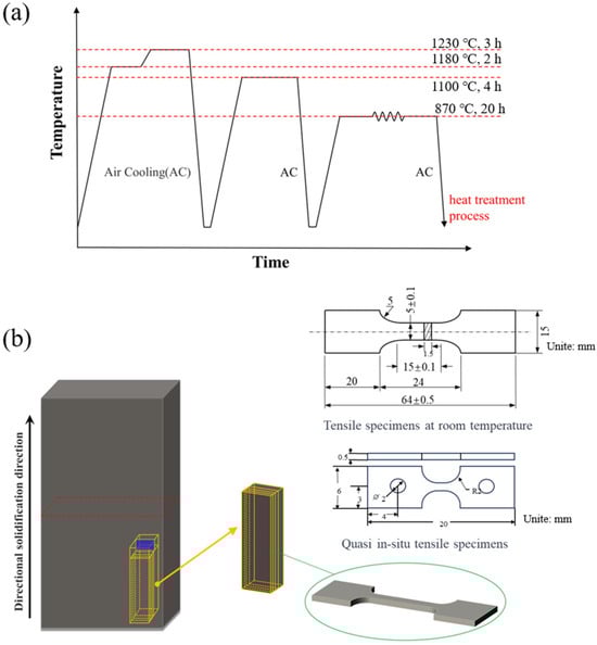 (a) Process flowchart for the heat treatment of DZ125 nickel-based superalloy and (b) dimensions of the tensile specimens and schematic illustration of the sampling process.