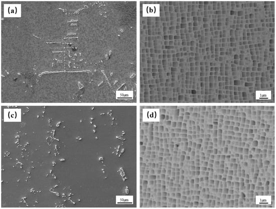 SEM observation of the morphology of carbides and γ′/γ phase (a,b) without HfO2 inclusions and (c,d) with HfO2 inclusions.