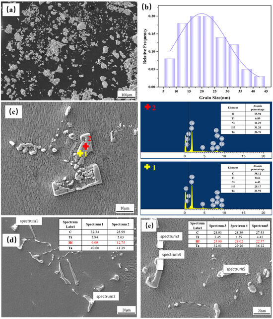 Figure 3a,b shows the morphology and particle size distribution of the HfO2 inclusions powder, respectively. The size of the added HfO2 inclusions powder was mostly around 20 µm. The EDS elemental analysis indicated that HfO2 enrichment was observed at the center of the blocky carbides, as shown in Figure 3c. The nucleating effect of oxides has also been observed in other studies []. The EDS results indicated that blocky carbides show significantly higher Hf element content, as illustrated in Figure 3d,e.