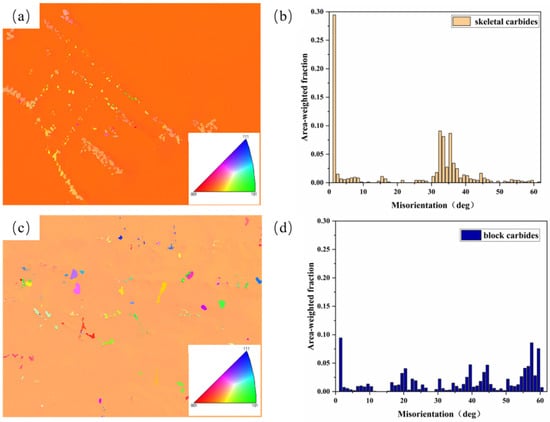 (a,c) Crystal orientation maps (COM) of skeletal carbides and block carbides and (b,d) corresponding misorientation distributions of phase boundaries between the carbides and the matrix.