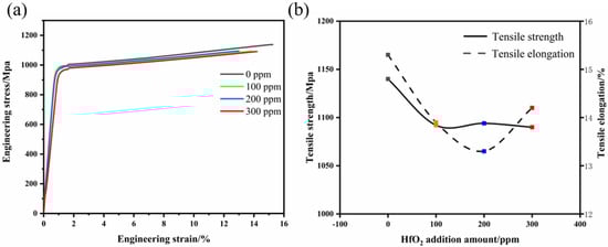 (a) Engineering stress-strain curve of DZ125 alloy after adding HfO2 inclusion (0–300 ppm) for room-temperature tensile test and (b) tensile strength and elongation changes after tensile test.