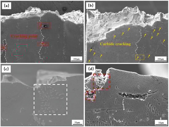 We utilized SEM to observe the morphology of secondary cracks on the fracture surface. As shown in Figure 7a,b, the cracks were mainly observed near the grain boundaries in samples without HfO2. In the samples with 300 ppm HfO2 inclusions, a noticeable increase in the density of secondary cracks was observed. In the sample without HfO2 addition, intact skeletal-shaped carbides were observed near the fracture surface, even in the region close to the fracture surface, as indicated by the white box in Figure 7c. However, in the sample with 300 ppm HfO2, the pulverization of block-shaped carbides was observed near the fracture surface, as indicated by the red box in Figure 7d.