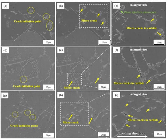 The SEM maps of different regions of skeletal carbide specimens under tensile strain: (a,d,g) formation of microcracks, (b,e,h) microcrack propagation, and (c,f,i) locally magnified views of microcracks.