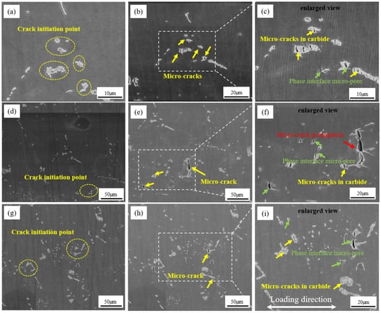 The SEM maps of different regions of blocky carbide specimens under tensile strain: (a,d,g) formation of microcracks, (b,e,h) microcrack propagation, and (c,f,i) locally magnified views of microcracks.