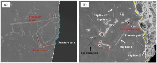 We also observed the microstructure of two quasi-in-situ tensile specimens after elongation fracturing. As shown in Figure 10a, the crack propagation morphology at the fracture presented a fine sawtooth shape for the skeletal carbide, indicating that the skeletal carbide plays a hindering role. At the fracture of the blocky carbide specimen, all the blocky carbides were broken. The secondary crack density in blocky carbides was higher than in the skeletal carbide. The crack propagation path was more jagged because the matrix was the main carrier of plastic deformation. When the block carbide broke, the shape variable of the surrounding matrix increased. The plastic deformation produced obvious slip lines, and the slip direction was 45°, as observed in Figure 10b. The slip systems crossed each other, preventing the fault from moving, and finally producing the crack source. Crack initiation occurred along the slip line, so a 90° deflection of the crack growth path was observed []. This finding also explains the decreased sample strength but slight increase in elongation with the addition of 300 ppm HfO2.