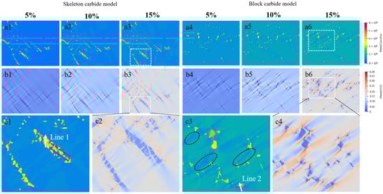 (a1–a3,b1–b3,c1,c2) Skeletal carbide model and (a4–a6,b4–b6,c3,c4) blocky carbide model stress field and strain field maps at 5%, 10%, and 15% strain.
