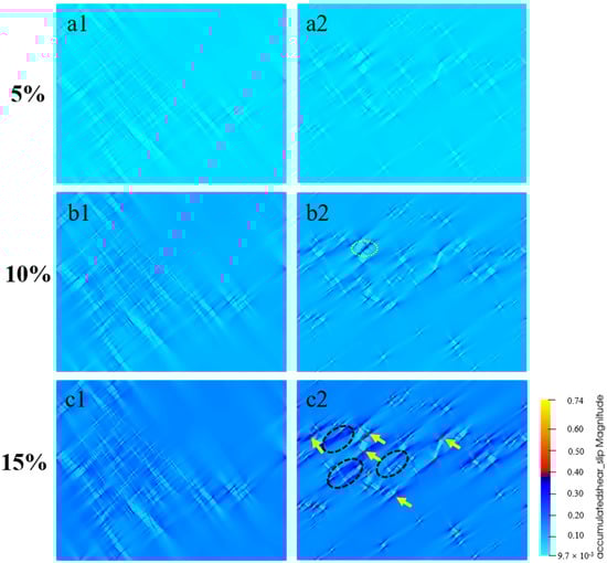(a1–c1) Skeletal carbide model and (a2–c2) blocky carbide model accumulated shear-slip distribution maps at 5%, 10%, and 15% strain.