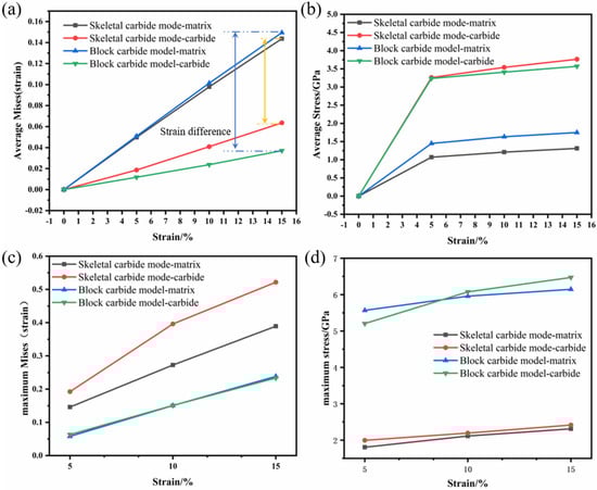 Figure 14a,b depicts the evolution process of average strain and stress under different tensile strains. During the deformation process, the average strain of the blocky carbide morphology remained lower than that of the skeletal morphology. In contrast, there was little difference in the average strain within the matrix at low strains. The differences became obvious with increased tensile strain. Moreover, the blocky carbide model exhibited a higher rate under the increase of tensile strain. In Figure 14a, the average strain difference between the blocky carbides and the matrix was greater than that between skeletal carbides, which showed an increasing trend. This finding suggests that there is a more severe strain incompatibility between the carbides and the matrix in the blocky carbide model. The average stress within the matrix of the blocky carbide model was higher than that in the skeletal carbide model, which is consistent with the pattern observed in average strain, as depicted in Figure 14b. The average stress on the carbides demonstrated consistency under low tensile loads. However, with the increase in tensile strain, the average stress on the skeletal carbides was slightly higher than that in blocky carbides. This finding was attributed to the relatively concentrated distribution of skeletal carbides, which makes them more prone to inducing stress concentration overall.