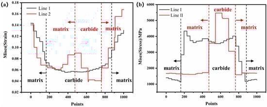 To qualitatively analyze the strain and stress distribution between the carbides and the matrix, the strain/stress curves passing through the carbides from the matrix were extracted. These findings helped summarize and analyze the influence of different carbide morphologies on strain/stress distribution. The white lines marked in Figure 12(c1,c3) offer a detailed assessment of different carbide morphologies’ influences on plastic deformation. Since carbides constitute the harder phase, the strain in the matrix was notably higher than in the carbides. From the curves, significant variations in strain and stress between the carbide/matrix interfaces are evident. Different carbide morphologies significantly impacted their own strain and stress distributions as well as those of the nearby matrix. Figure 15a shows that the strain rapidly decreases as the data points enter the interior of the carbides. The strain distribution within skeletal carbides was relatively uniform, whereas blocky carbides exhibited a noticeably uneven distribution with larger fluctuations. Moreover, the stress distribution revealed that blocky carbides could induce higher stress concentrations, as shown in Figure 15b. Therefore, during in-situ tensile experiments and fracture analyses, we observed that blocky carbides experienced more severe fractures, leading to the initiation of more micro-cracks.