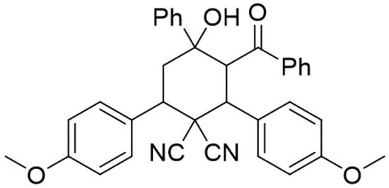 The chemical structure of 3-benzoyl-4-hydroxy-2,6-bis(4-methoxyphenyl)-4-phenylcyclohexane-1,1-dicarbonitrile.