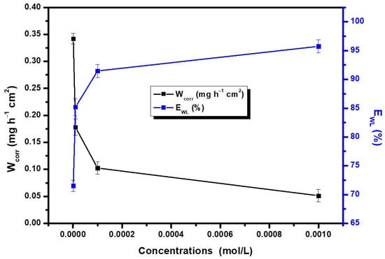 where Wcorr and W′corr, respectively, represent the corrosion rates of the CS after immersion in the absence and presence of the inhibitor.
