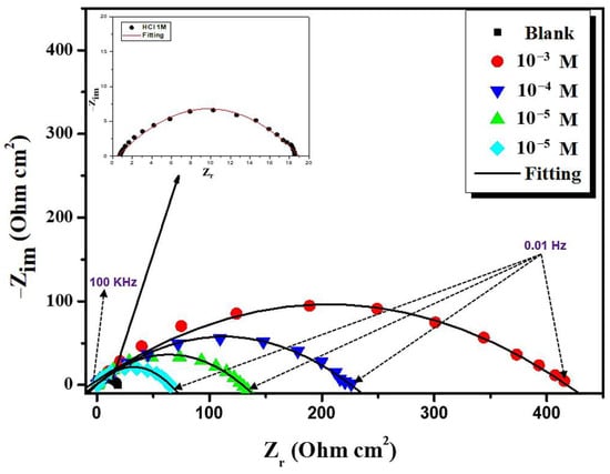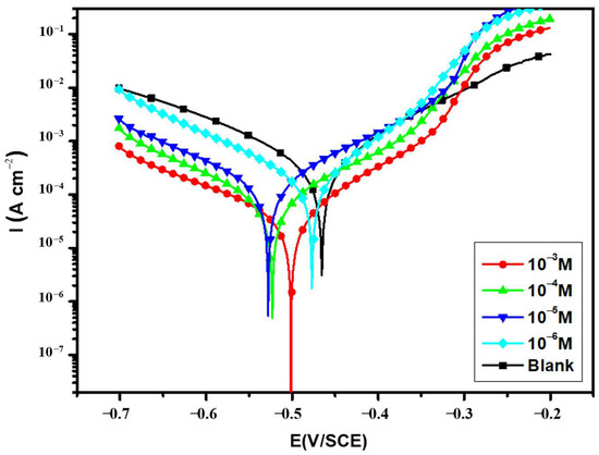 Furthermore, it can be seen from Table 2 that Icorr decreases with increasing inhibitor concentrations and the inhibition efficiency values reach 94.18% at 10−3 of inhibitor. In addition, if the shift in Ecorr is greater than 85 mV compared to Ecorr in an uninhibited solution, the inhibitor can be identified as either cathodic or anodic in nature; otherwise, it can be regarded as a mixed inhibitor [46,47,48,49]. In this study, the displacement in Ecorr is less than 85 mV compared to the blank solution, indicating that BMPD acts as a mixed-type inhibitor.