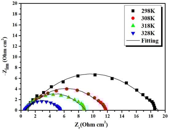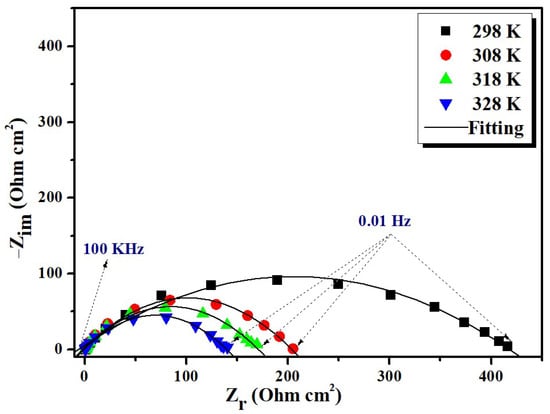 Temperature has a considerable effect on the corrosion rate and inhibiting efficacy, particularly in an acidic medium. The study of the temperature effect on the corrosion behavior of the CS using the EIS technique at various temperatures in the absence and the presence of BMPD at 10−3 M were studied and shown in Figure 7 and Figure 8 and the corresponding data are given in Table 4. In the studied temperature range, the values of Rct decrease with increasing temperature in uninhibited and inhibited solutions. The decrease in the charge transfer resistance can be attributed to the decrease in the average kinetic energy of the interacting species. Nevertheless, BMPD remained an effective inhibitor as the inhibition performance had no effect with the increase in temperature. This may be attributed to the higher adsorption of inhibitor molecules onto the metal surface.