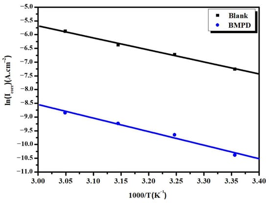 where A is the Arrhenius pre-exponential factor, R is the universal gas constant, and T is the absolute temperature. The values of the activation energy of the metal dissolution in the inhibitor-containing solution or inhibitor-free solution can be determined from the slope (−Ea/R) of ln Icorr vs. (1000/T) as shown in Figure 9.