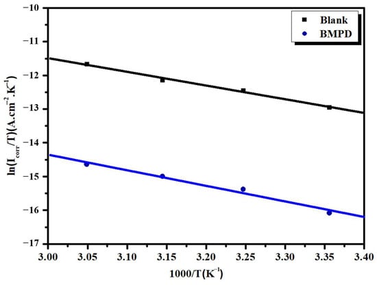 Relation between ln (Icorr/T) and 1000/T at different temperatures in the absence and presence of BMPD.