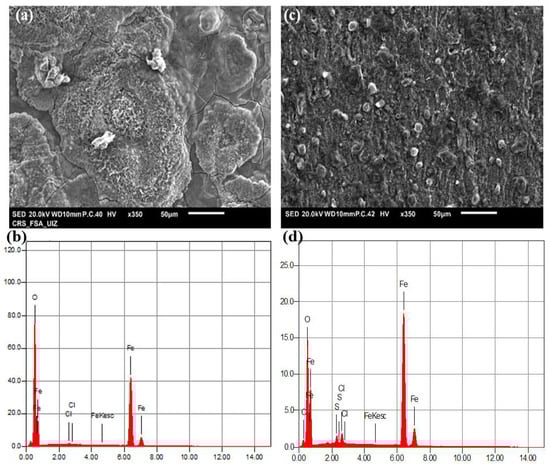 SEM images and EDS mapping of CS after 24 h of immersion in 1 M HCl solution without (a,b) and with (c,d) 10−3 M of the BMPD inhibitor.