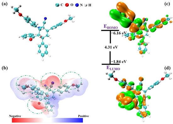 (a) Optimized geometry configuration, (b) electrostatic potential isosurface of the BMPD molecule, and its molecular orbital density distributions; (c) HOMO, (d) LUMO. The calculated values of the relevant parameters, including EHOMO, ELUMO, and ΔE, are also presented.
