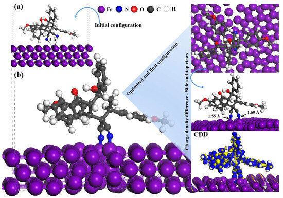 Side and top views of (a) the initial and (b) most stable optimized geometries of BMPD on the Fe(110) surface. The charge density difference (CDD) distribution for the adsorption of BMPD is also given.
