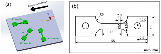 As illustrated in (Figure 1a), hot tensile test samples were machined from the sheet with 0°, 45° or 90° along the extrusion direction (ED). The size of the sample is shown in (Figure 1b). The hot tension was conducted in a Gleeble3500 machine (DSI, St. Paul, MN, USA), the heating rate was 5 °C/s, and, when the target temperature was obtained, the samples were held for 2 min. The tensile temperatures are 300 °C and 400 °C, and the strain rates are 0.1 s−1, 0.01 s−1 and 0.001 s−1. Once the tensions were finished, the samples were immediately water cooled to freeze the microstructures.