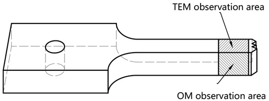 The optical observation samples were extracted from the fracture samples demonstrated in (Figure 2). The samples were ground and polished to obtain a mirror surface. Then, the electrolytic etching was applied to the microstructure, the etching solution was 120 mL water and 4 mL HBF4, the etching voltage was 18 V, the etching time ranged from 1 to 3 min, and microstructural observation was performed using an optical microscope (AX10, Zeiss, Oberkochen, Baden-Württemberg, Germany). The SEM (FEI, Hillsboro, OR, USA) was adopted to observe the fracture morphology. TEM observation samples with a thickness of 0.5 mm were obtained by wire electrical discharge machining process. Then, the slice was ground to 70 μm, the slice was punched into a round plate with a diameter of 3 mm, and subjected to chemical thinning and perforation by double spraying on the MIP-1A magnetic-driven double spraying thinning instrument. The microstructure was then observed under the Talos F200X (FEI, Hillsboro, OR, USA). X-ray diffractometer (BRUKER, Billerica, MA, USA) was used to conduct texture measurement, the voltage is 40 kV, and the current is 40 mA. The reflection method was used to measure the incomplete polar maps (0°~70°) of {111}, {200} and {220} planes, and then the standard polar map was synthesized, and the orientation distribution function ODF map was calculated.