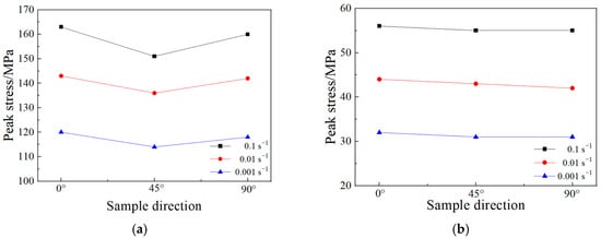 Figure 4. Peak stress as a function of sample direction: (a) 300 °C, (b) 400 °C.