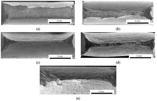 Figure 5. Tensile macroscopic fracture under different deformation conditions: (a) 0° 300 °C 0.1 s−1, (b) 0° 400 °C 0.1 s−1, (c) 0° 400 °C 0.001 s−1, (d) 45° 400 °C 0.001 s−1, (e) 90° 400 °C 0.001 s−1.