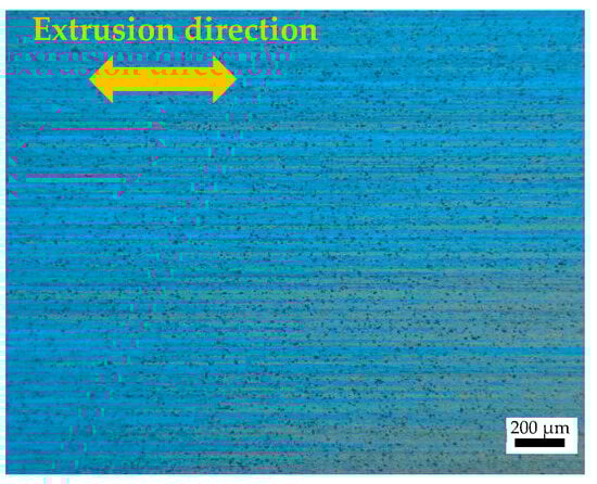 As shown in Figure 7, the microstructure of the extruded 6082 aluminum alloy along the extrusion direction. The microstructure is mainly a fibrous grain structure. The grain boundaries are well defined. The width of the grains was 20–50 μm. Previous studies imply that the fibrous grain structure can lead to the anisotropy of mechanical behavior [32,33]. Yang et al. [26] tested the compression behavior of Al-Zn-Mg-Cu alloy with a fibrous grain structure and deformation temperature ranges from 320 to 340 °C. It is found that the flow stress of 0° specimens ranks first, however, the corresponding values of the 90° specimen are the lowest. Ye et al. [27] explored the flow stress of Al-Mg-Si alloy at dynamic impact and claimed that the fibrous grains are the main reason that leads to the highest stress level of 0° specimens. It is widely accepted that the grain boundaries can impede the motion of dislocations; however, the fibrous grains lead to the various densities of grain boundaries in different direction samples. During the deformation, an extensive amount of dislocations will accumulate near the grain boundary, which results in the lattice distortion within the grain boundary, namely, grain boundary densities decide the effect of strengthening effect. Therefore, the different direction samples display anisotropic mechanical properties [34].