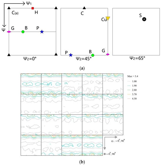 Figure 8. (a) Typical texture components in the ODF sections (φ2 = 0°, φ2 = 45°, φ2 = 65°), (b) the ODF map of the 6082 sheet.