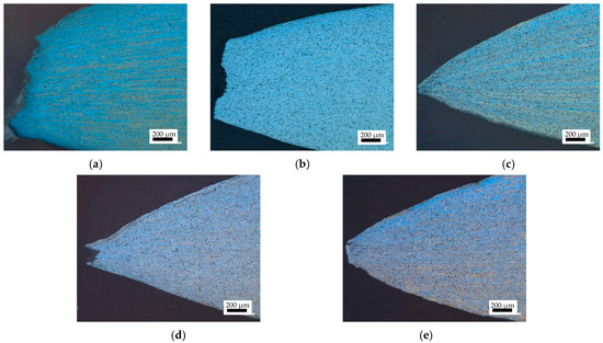 Figure 9. Microstructure of 6082 sheets after deformation: (a) 0° 300 °C 0.1 s−1, (b) 0° 400 °C 0.1 s−1, (c) 0° 400 °C 0.001 s−1, (d) 45° 400 °C 0.001 s−1, (e) 90° 400 °C 0.001 s−1.