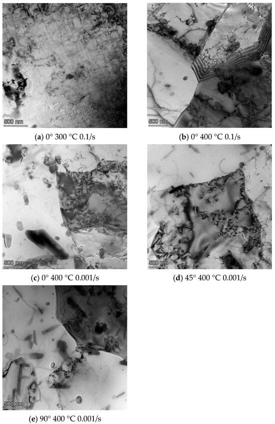 Figure 10. TEM images of 6082 alloy after tension: (a) 0° 300 °C 0.1 s−1, (b) 0° 400 °C 0.1 s−1, (c) 0° 400 °C 0.001 s−1, (d) 45° 400 °C 0.001 s−1, (e) 90° 400 °C 0.001 s−1.