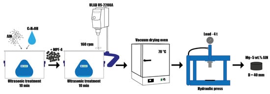 Magnesium alloy ZK51A consisting of 93.58 to 95.4% Mg, 4 to 5% Zn and 0.6 to 1.1% Zr produced by a conductor electric explosion in nitrogen [36] and machine-milled magnesium powder MPF-4 were used as initial materials. The AlN nanopowder was preliminary deagglomerated and cleaned ultrasonically in ethyl alcohol for 10 min using an Ultrasonic Cleaner DK-300S. The mass ratio of the AlN nanopowder and ethyl alcohol was 1:5. The micropowder MPF-4 was added to the obtained slurry in the amount of 95 wt.% relative to the AlN content and then ultrasonically treated for 10 min with simultaneous stirring in an ULAB US-2200A overhead stirrer rotating at 160 rpm for 10 min. The powder mix Mg–5 wt.% AlN was dried in a vacuum oven at 70 °C. The obtained powder mix was compressed into tablets using a hydraulic press capable of applying a 4 t load with a steel mold with a working area of 40 mm (Figure 1).