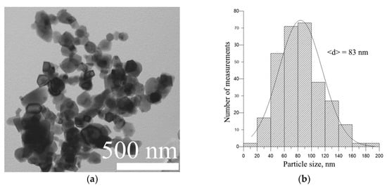 Figure 3a presents the TEM image of AlN nanoparticles obtained by the conductor electric explosion. The average particle size is 83 nm (Figure 3b). The powder also consists of 200 µm particle agglomerates. The elemental composition of this powder is presented in Table 1.