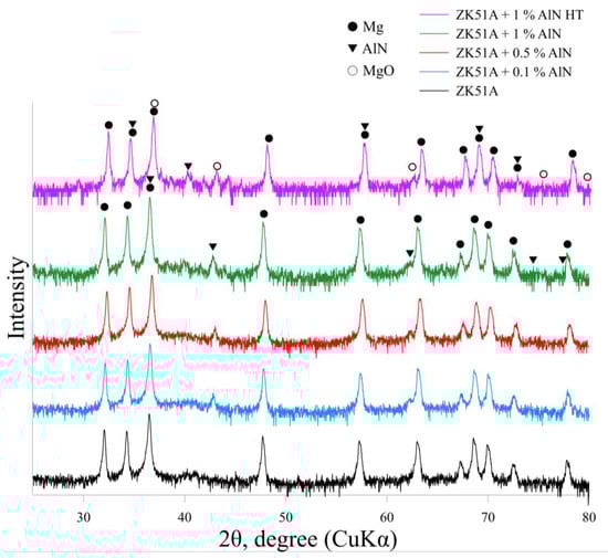 According to the X-ray diffraction (XRD) analysis, the initial ZK51A alloy consists of α-Mg with lattice parameters a = 0.32040 nm and c = 0.52005 nm, which correlates with the data from [38,39]. The phase composition analysis of the alloy specimens with nanoparticles shows the presence of aluminum nitride with the content varying in a wide range that can be attributed to the nonuniform particle distribution and a small scan area. The size of the coherent scattering region (CSR) of the AlN phase is within the range of the measured powder particle size. Heat treatment does not affect the SCR size of AlN nanoparticles, although for the solid solution Mg–Zn, it significantly grows. Figure 4 and Table 2 show parameters of phases and the structure of synthesized alloys.