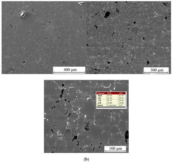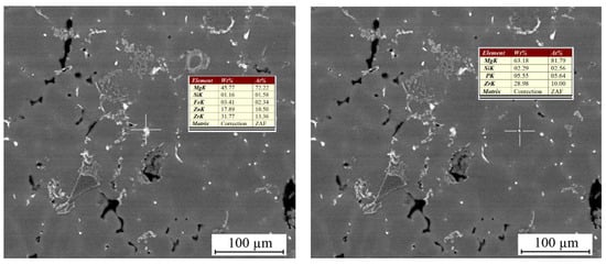 SEM in combination with energy dispersive X-ray spectroscopy (SEM-EDS) in Figure 8, shows large dark areas identified as fragments of the Mg–AlN master alloy. In addition to the MgZn phase, the intergranular space consists of the Zr-containing phase. According to [9,16], the Mg–Zn–Zr system cast alloys consist of 4.5 to 8.5% of zinc and 0.8 to 1.0% of zirconium, and the latter generates Zn2Zr3, ZnZr2, and Zn2Zr phases. Depending on the heat treatment conditions, the region with ZnZr intermetallic formations can change. Figure 9 presents the elemental composition of inclusions in the ZK51A + 1% AlN alloy after heat treatment. Heat treatment promotes homogenization of the alloy microstructure due to diffusion interaction between the elements of the undissolved master alloy and the magnesium matrix.