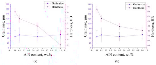 Figure 10. Dependence of grain size and hardness of AlN content in cast (a) and heat-treated (b) alloys.