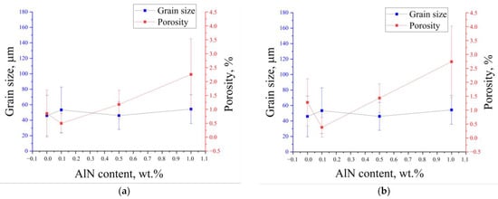 Figure 11. Dependence of grain size and porosity on AlN content in cast (a) and heat-treated (b) alloys.