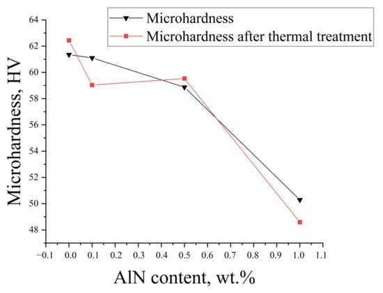 The microhardness AlN content dependence on the AlN content are given in Figure 12 for the alloy before and after heat treatment. It is found that heat treatment has no effect on the microhardness, while the increased nanoparticle content results in its reduction, i.e., 62 and ~50 HV for the initial alloy and the alloy with 1 wt.% AlN, respectively.