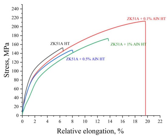 Figure 13 presents the stress–strain curves for the obtained alloys after heat treatment. As can be seen from Table 4, the yield strength, tensile strength, and plasticity of the initial alloy without nanoparticles are 63 MPa, 151 MPa, and 6.4%, respectively. After the addition of 0.1, 0.5, and 1 wt.% AlN nanoparticles, the yield strength grows up to 72, 67, and 86 MPa, respectively. The highest growth in the yield strength and plasticity relative to the initial allo, is observed at 0.1 wt.% AlN, viz. from 151 to 212 MPa and from 6.4 to 19.7%, respectively.