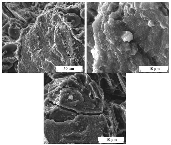 SEM observations of the fracture surface after tensile strength testing show a ductile transgranular fracture mechanism for all alloys. SEM images of the fracture surface of heat-treated alloys are presented in Figure 14a–d. There is a particle coalescence comprising aluminum (see Figure 15). These results would suggest that although introduced non-uniformly, AlN nanoparticles are present in the structure and thus some of them cannot be identified due to their nanoscale size.