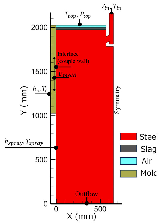 The outlet was set as the outflow boundary, assuming that the flow at the outlet was fully developed and the gradient value of each variable along the flow direction was zero. The copper plate and SEN walls had a small amount of heat loss, which was no heat loss by default. The fluid-solid interface was set as a coupling wall, and the heat flux and velocity transfer are realized through coupling. The first cold zone and secondary cooling zone were set as convection. The heat transfer coefficient of the first cold zone ( h c ) was determined by Equation (5) [30]., and the temperature of the boundary ( T c ) was 305 K. The heat transfer coefficient of the secondary cooling zone ( h s p r a y ) was used to determine as in Equation (6) [30]., and the boundary temperature ( T s p r a y ) was set to 300 K. The initial thickness of mold powder and air were 25 mm, which were patched on the top of the model. Initially, the steel in the mold was liquid, hence, resulting initial temperature of 1805 K of fluid, while initial temperature of copper plate was 405 K. The specific boundary condition was depicted in Figure 2. The break temperature was used to distinguish between solid and liquid mold powder films, as the viscosity increased dramatically below the break temperature. The detail material properties were listed in Table 2.