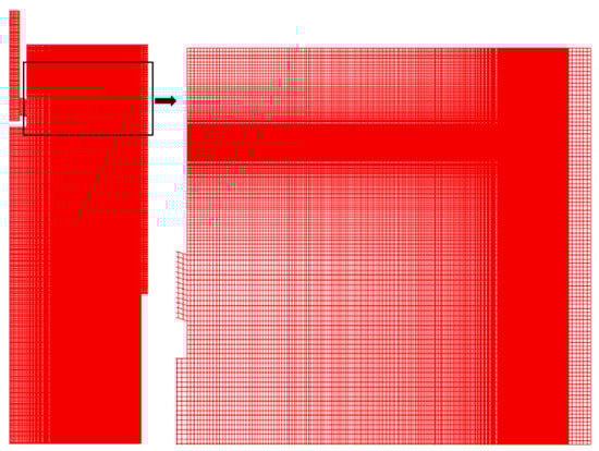 The upper surface of the mold was set as a free surface, the pressure was set to atmospheric pressure ( P t o p = 101,325 Pa), and the temperature was set to room temperature ( T t o p = 303 K). The SEN inlet was set as the velocity inlet boundary, the temperature of inlet was set to pouring temperature ( T i n = 1825 K), and the inlet velocity was determined by mass conservation as shown in Equation (4).