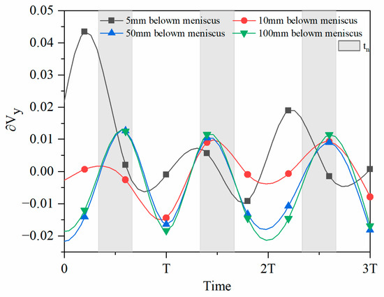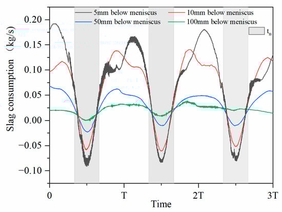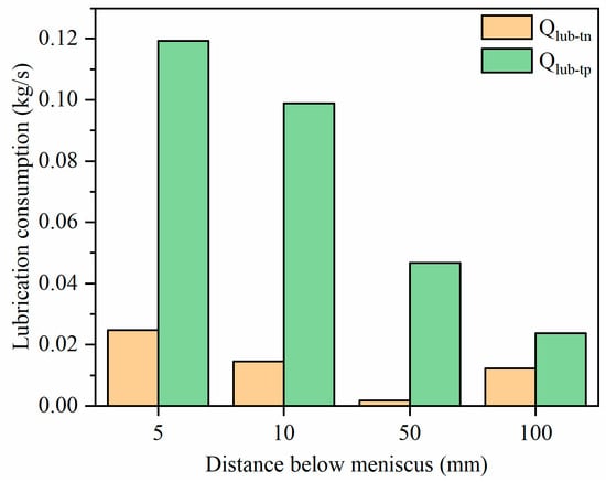 Lubrication consumption (Qlub, kg/s) was mold powder consumption in liquid mold powder film. The Qlub at 5, 10, 50, 100 mm below the meniscus was monitored. The transient lubrication consumption in the adjacent three cycles was illustrated in Figure 4, where “T” was the total period of the oscillation cycle. The mold powder consumption was within −0.092 to 0.19 kg/s. The variation of Qlub exhibited periodic, it was negative consumption near the meniscus during the tn, that trend weaken to disappear with the increase of the distance below the meniscus. During the tp, the lubrication consumption increased with the increase of velocity difference between the mold and shell. However, during the tn, the velocity difference gradually decreased as the mold accelerated downward, and the lubrication consumption gradually decreased. The maximum Qlub appeared during the tp, while the minimum occurred during tn. The increase in the distance below the initial meniscus from 5 mm to 100 mm, resulted in a decrease of the variation of Qlub and gradually became stable, with average values of 0.0706, 0.0635, 0.0298, and 0.0237 kg/s, respectively. Mold powder consumption during the tn and tp at different locations below the meniscus was demonstrated in Figure 5, Qlub during the tp consumed more than tn, hence, increasing the tn can increase the average lubrication consumption, which was beneficial to lubrication, reduce and eliminate the surface defects of the slabs.