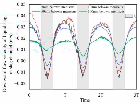 With the increase of the distance below the meniscus from 5 to 100 mm, the downward flow velocity of liquid mold powder was within −0.016 to 0.037, −0.014 to 0.042, −0.0059 to 0.030 and 0.0040 to 0.022 m/s, respectively, the downward flow velocity and variation decreased. Downward flow velocity was determined by velocity of mold oscillation and casting speed.