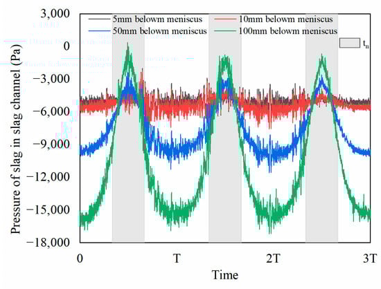 The downward flow velocity of the liquid mold powder and pressure of mold powder in mold powder channel were depicted in Figure 6 and Figure 7, respectively, where the downward flow velocity of liquid mold powder was positive and the static pressure of molten steel was positive pressure. The variation of velocity and pressure exhibited were opposite, which was in accordance with Bernoulli’s principle. The variation in downward flow velocity of liquid mold powder exhibited a consistent correlation with the mold powder consumption. During the tn, liquid mold powder near the meniscus flowed upward, which was affected by the oscillation of mold and movement of slag rim, the pressure in mold powder channel increased.